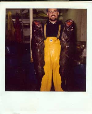 Todd Wendt, commerical fisherman, from years gone past holding two massive sable fish (black cod).